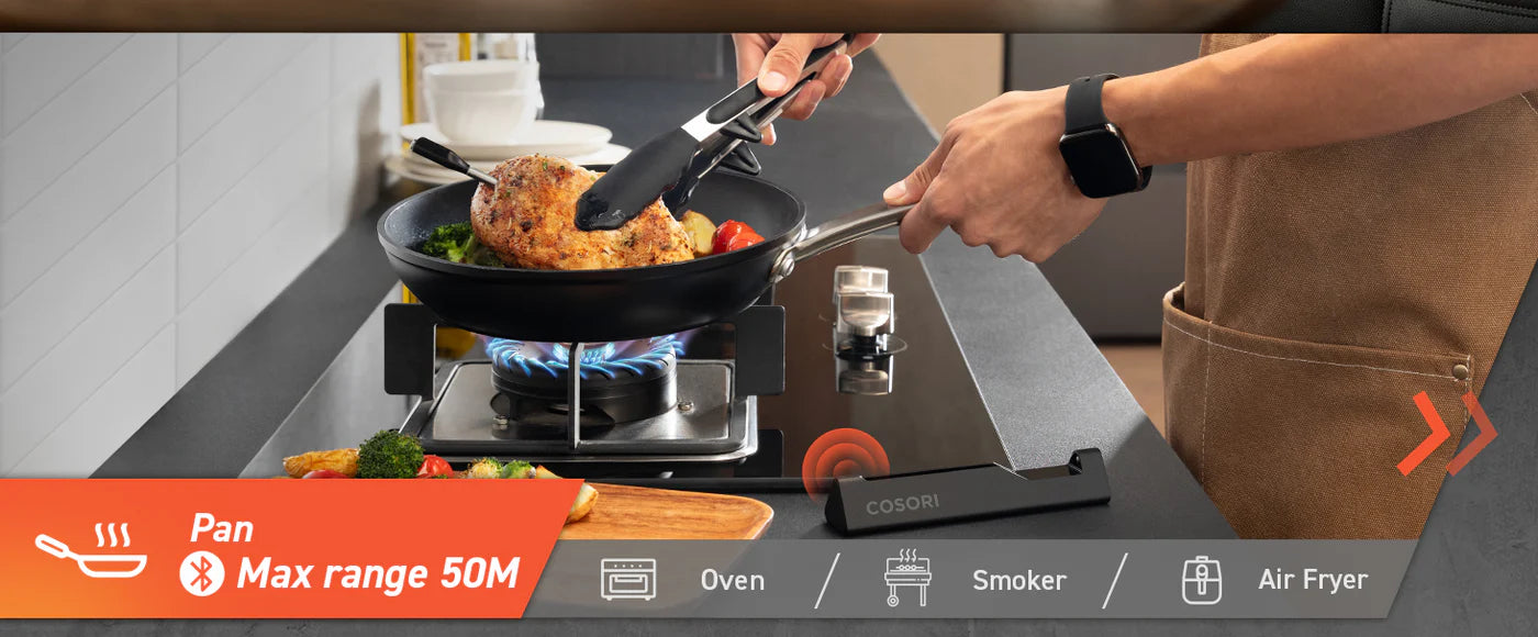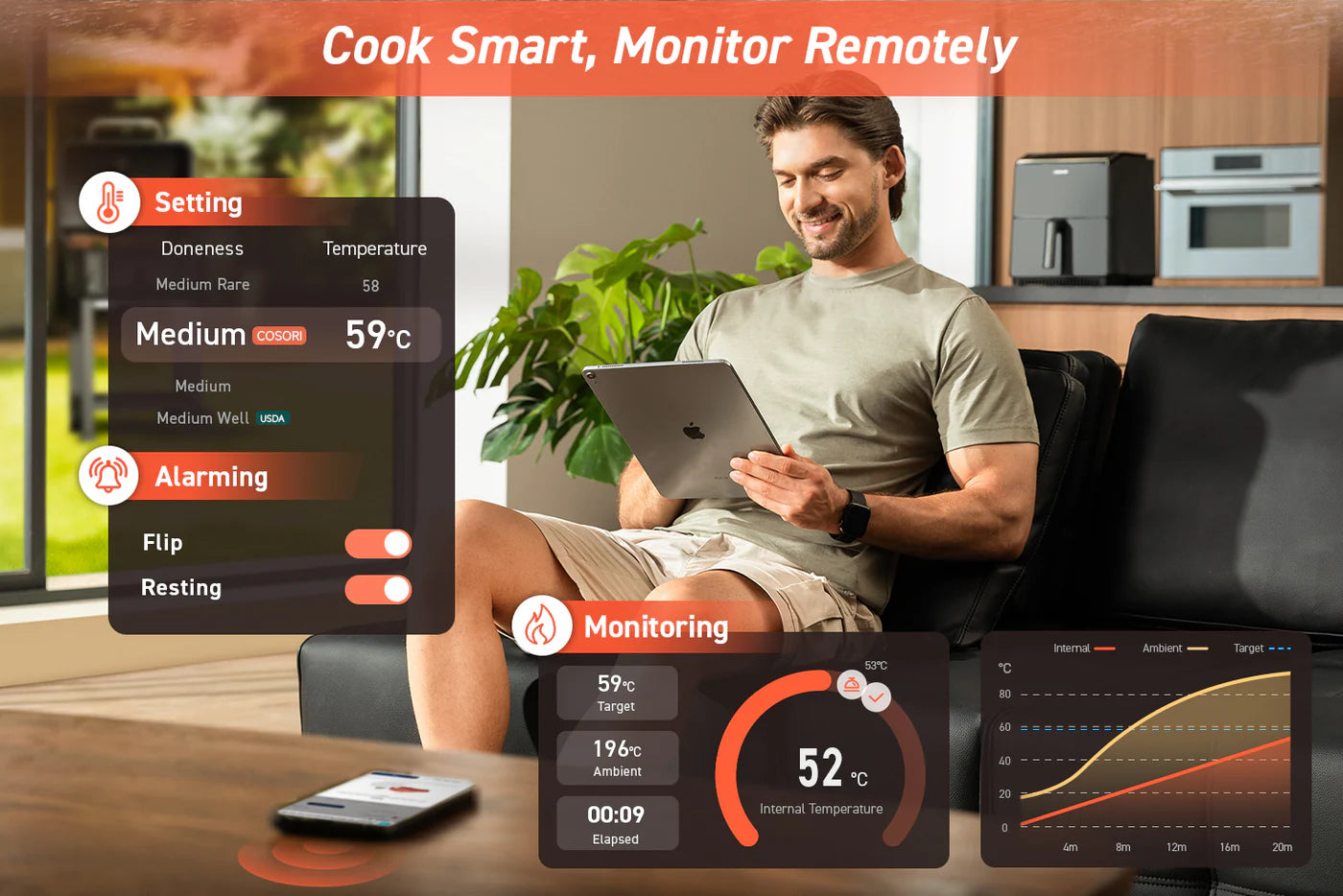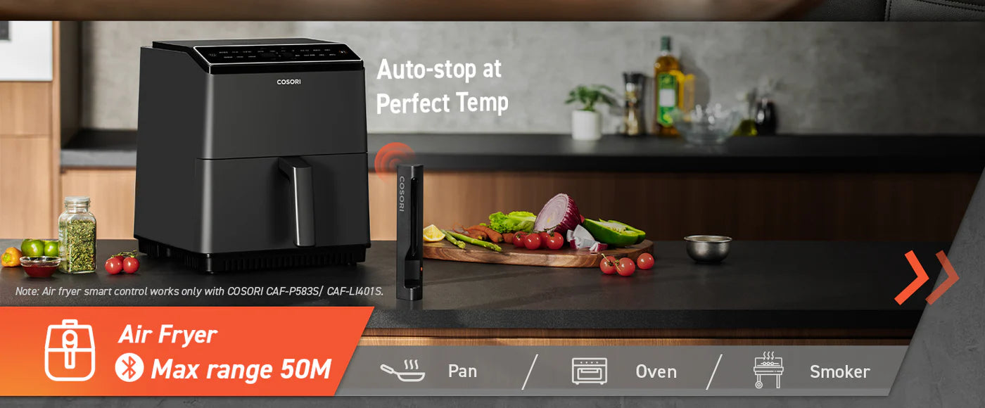- Smart Tillagning: Välj önskad tillagningsgrad i COSORI-appen och termometern synkroniseras med COSORI Dual Blaze airfryer, så du slipper ställa in tid och temperatur manuellt.